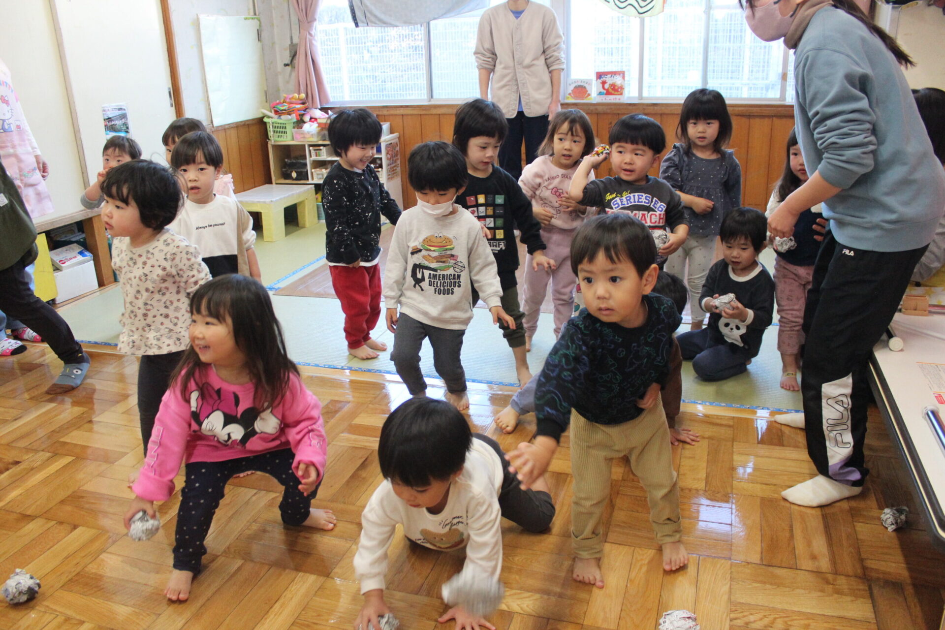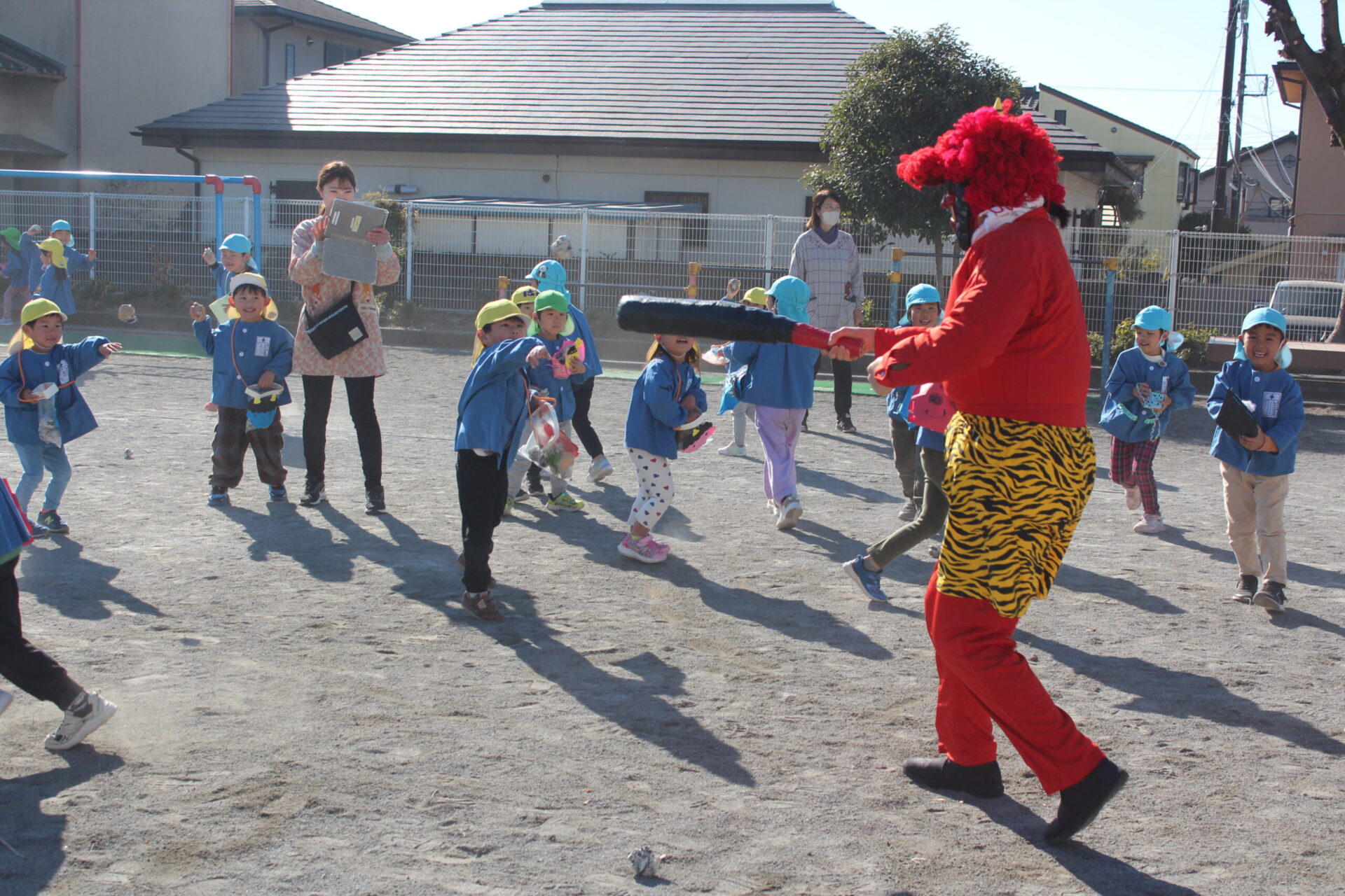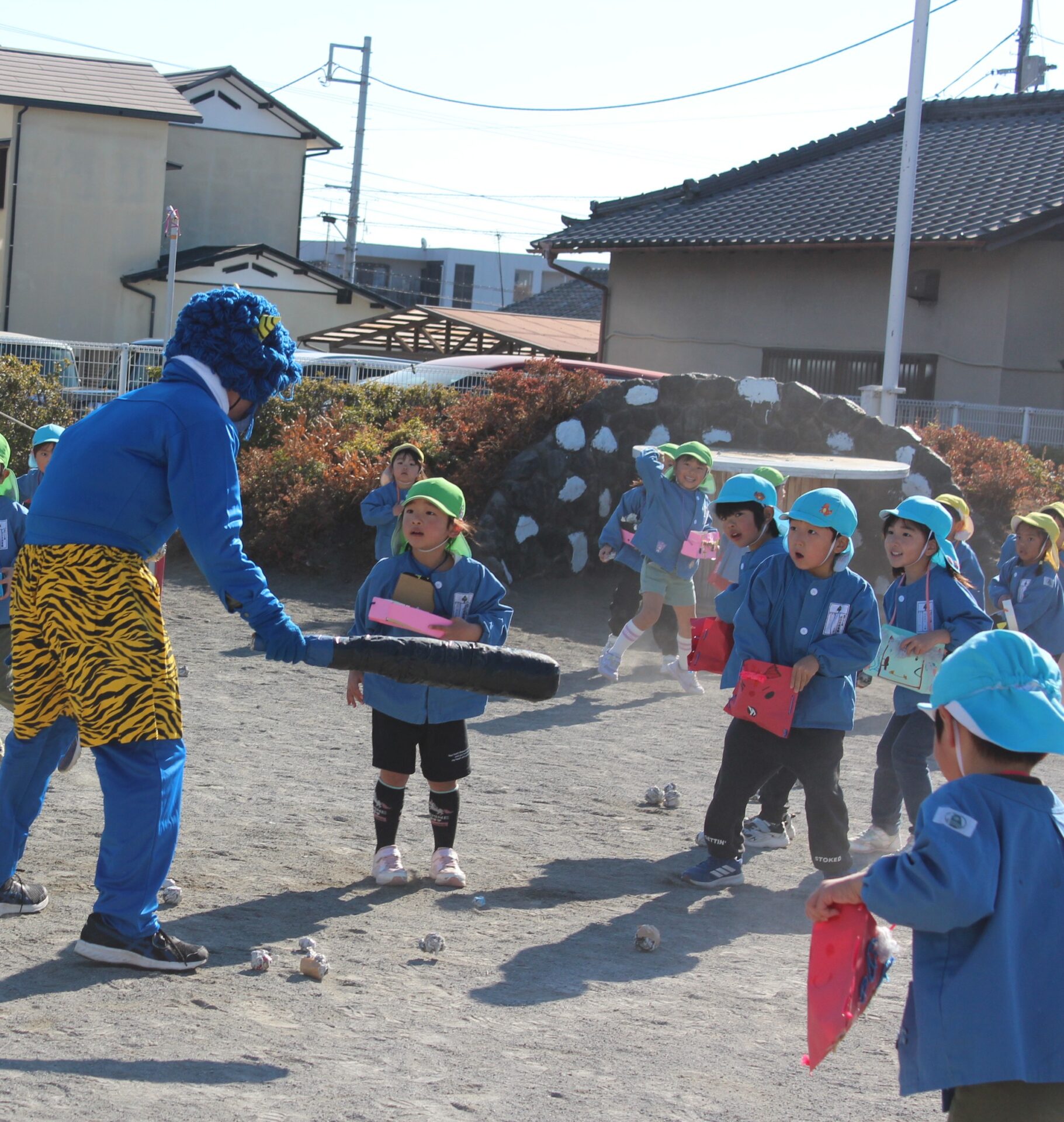 赤鬼・青鬼が「まいりました」と退散した後は、福の神様にお菓子をもらいニコニコでした。今年も元気いっぱいに過ごせそうな杉の木保育園の子どもたちです。