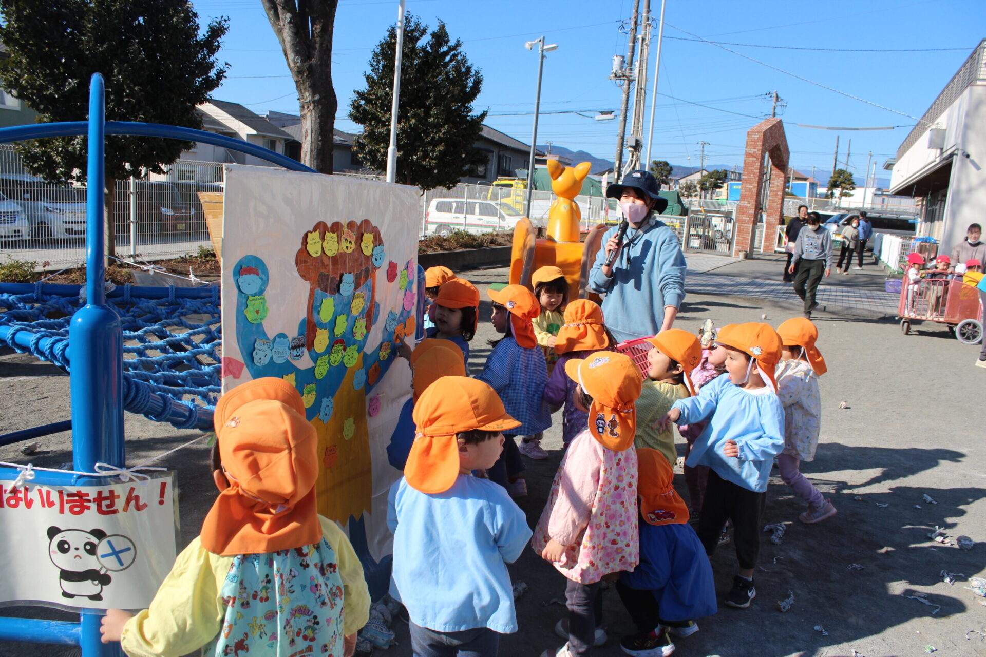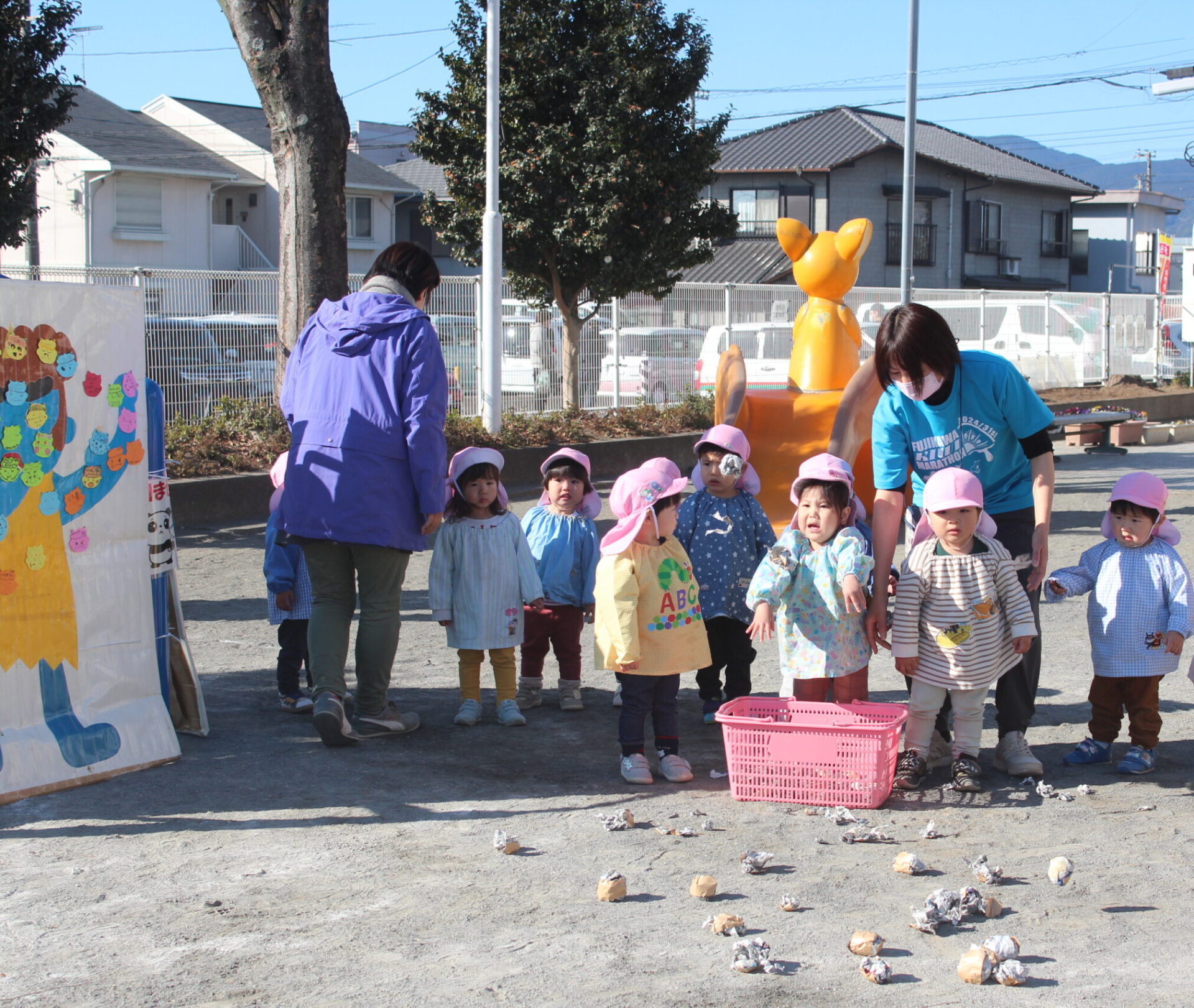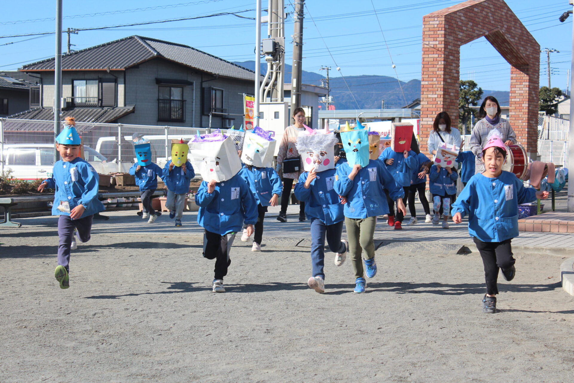 赤鬼・青鬼が「まいりました」と退散した後は、福の神様にお菓子をもらいニコニコでした。今年も元気いっぱいに過ごせそうな杉の木保育園の子どもたちです。
