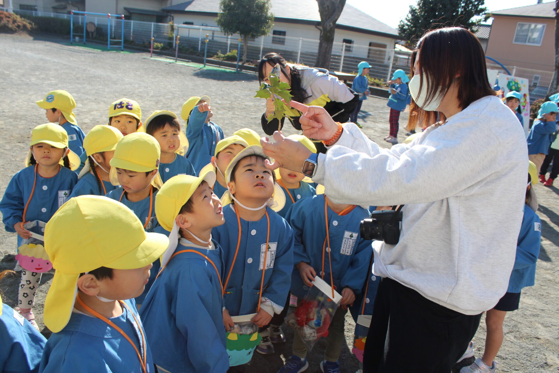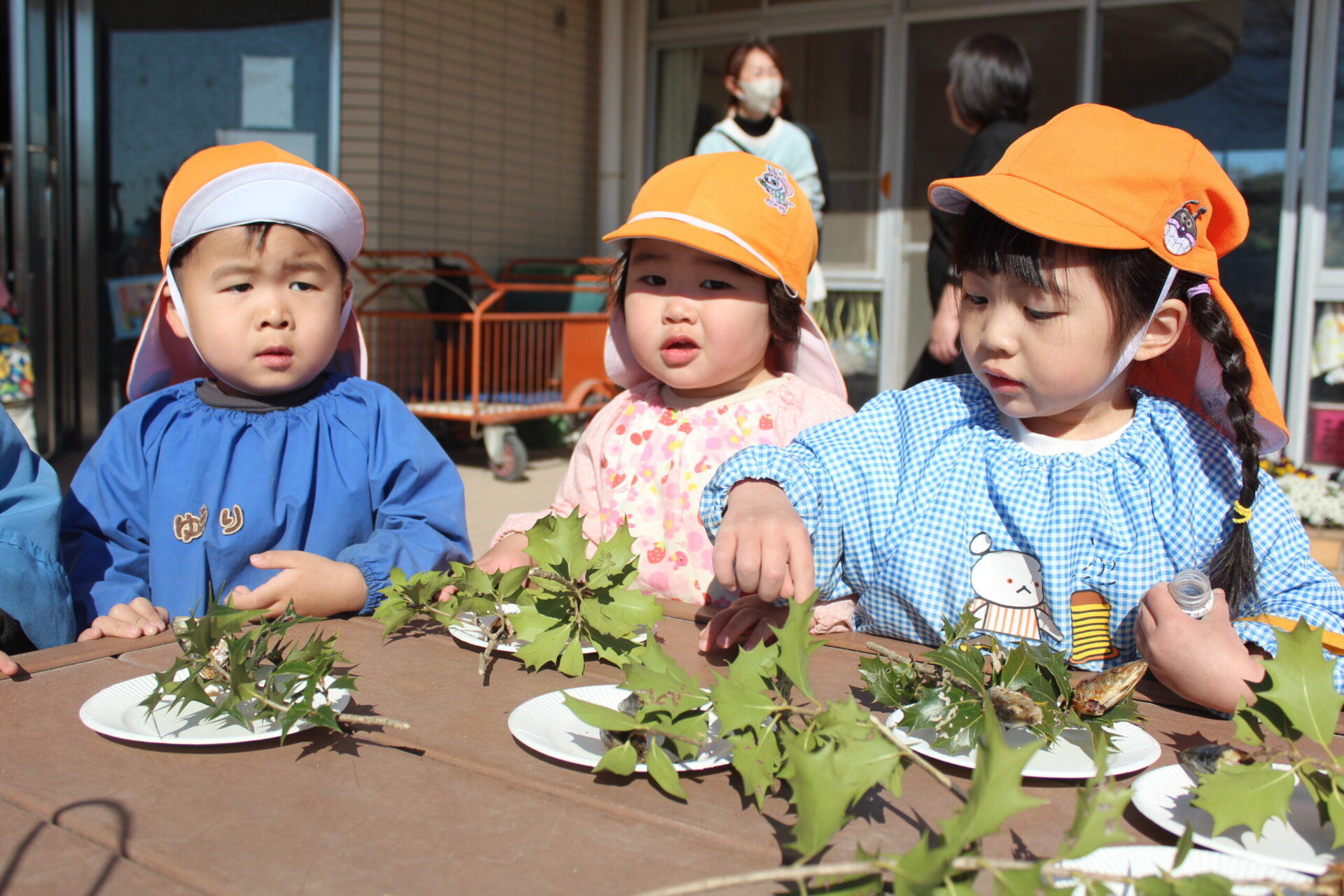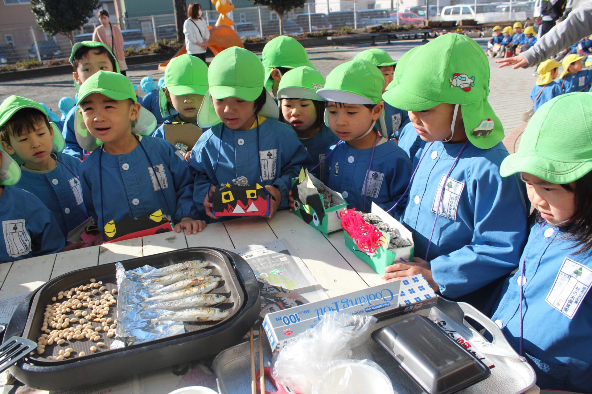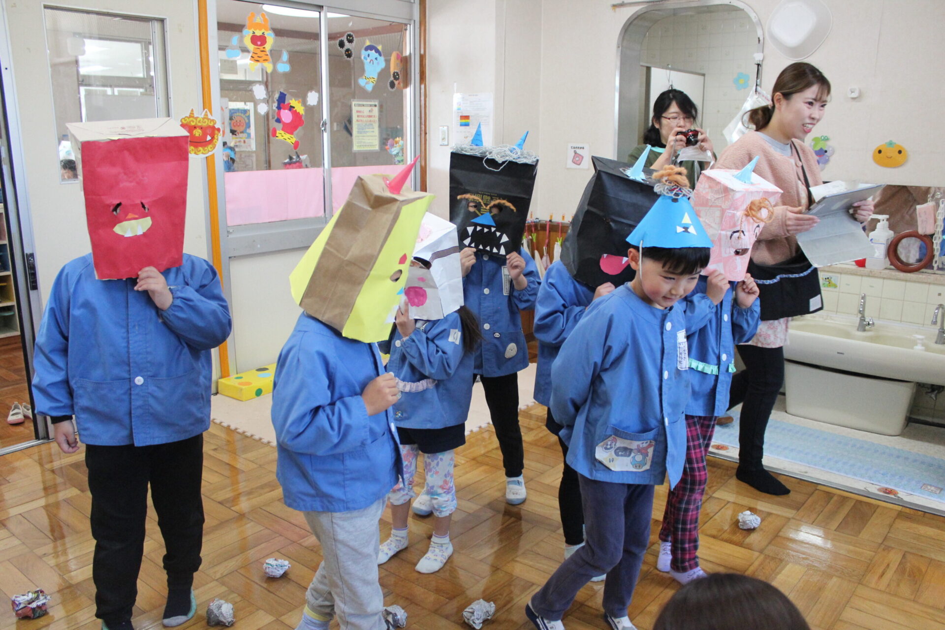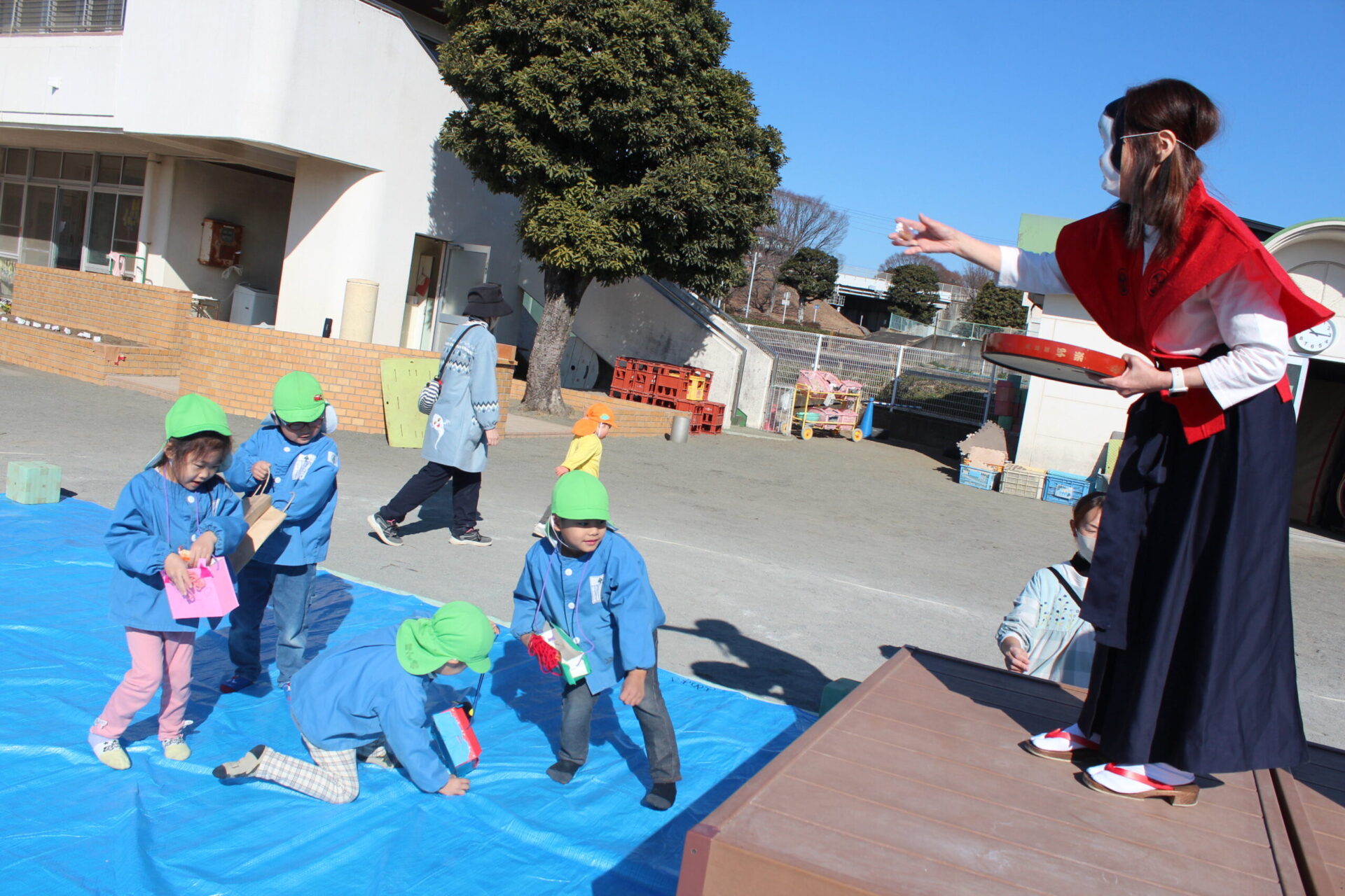 太鼓の音とともに年長組さんの鬼が登場すると、「おには~そと!」と元気な声で豆を投げて鬼退治を楽しみました。小さいクラスの子には優しくそっと近づくなど、年長さんの優しさも感じました。