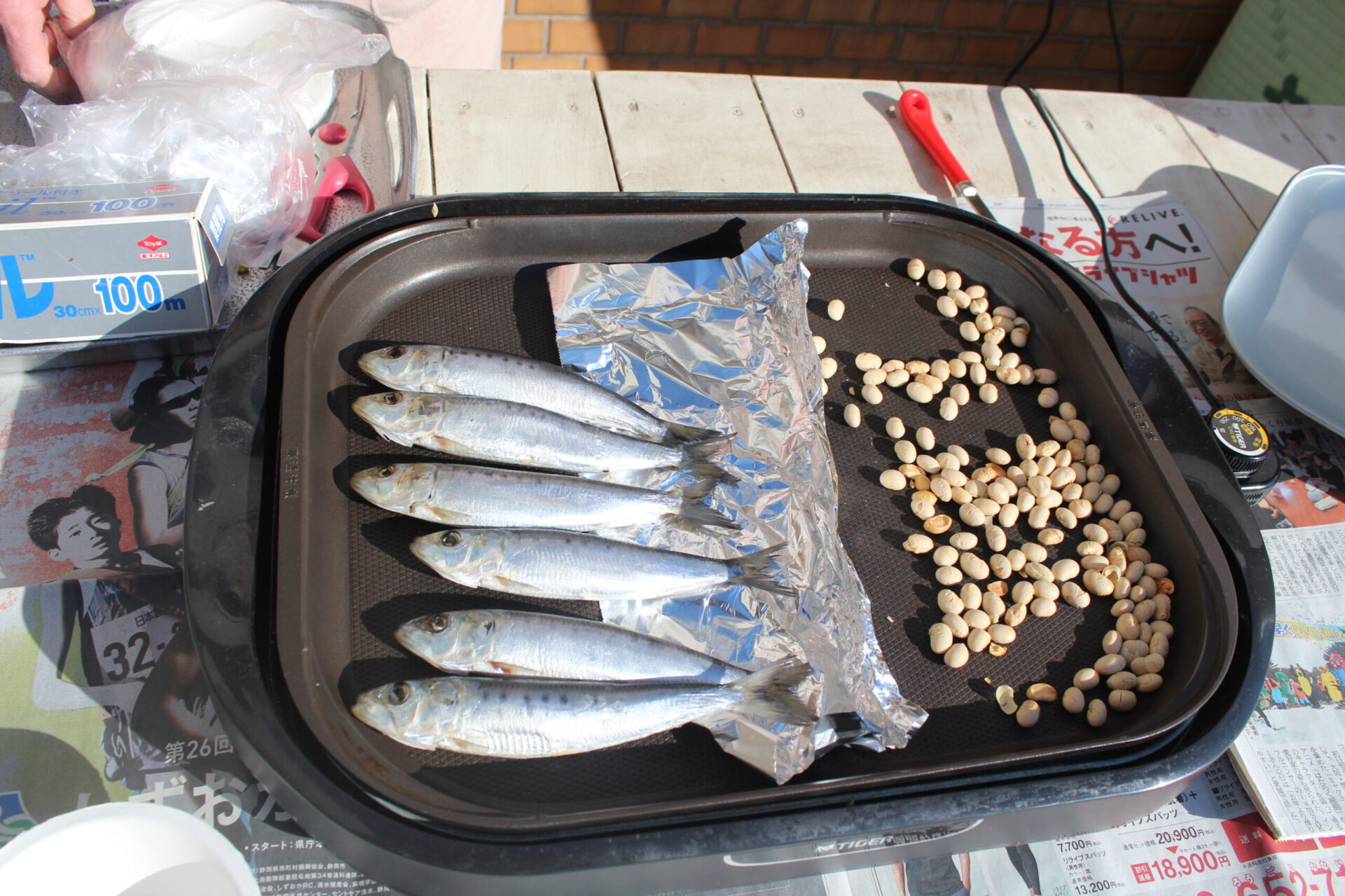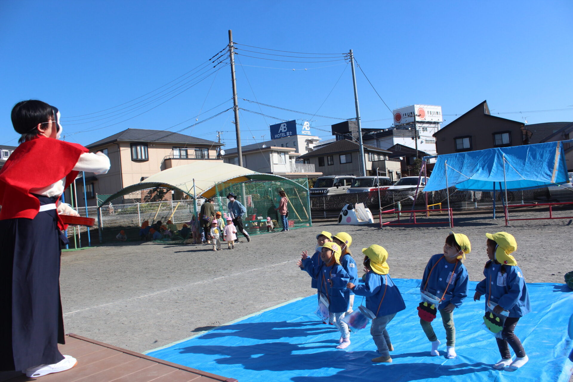 太鼓の音に何かを察知して先生の後ろに隠れる子、怖がりながらも豆をまきにいく子、遠くから眺める子。いろいろな姿が見られました。