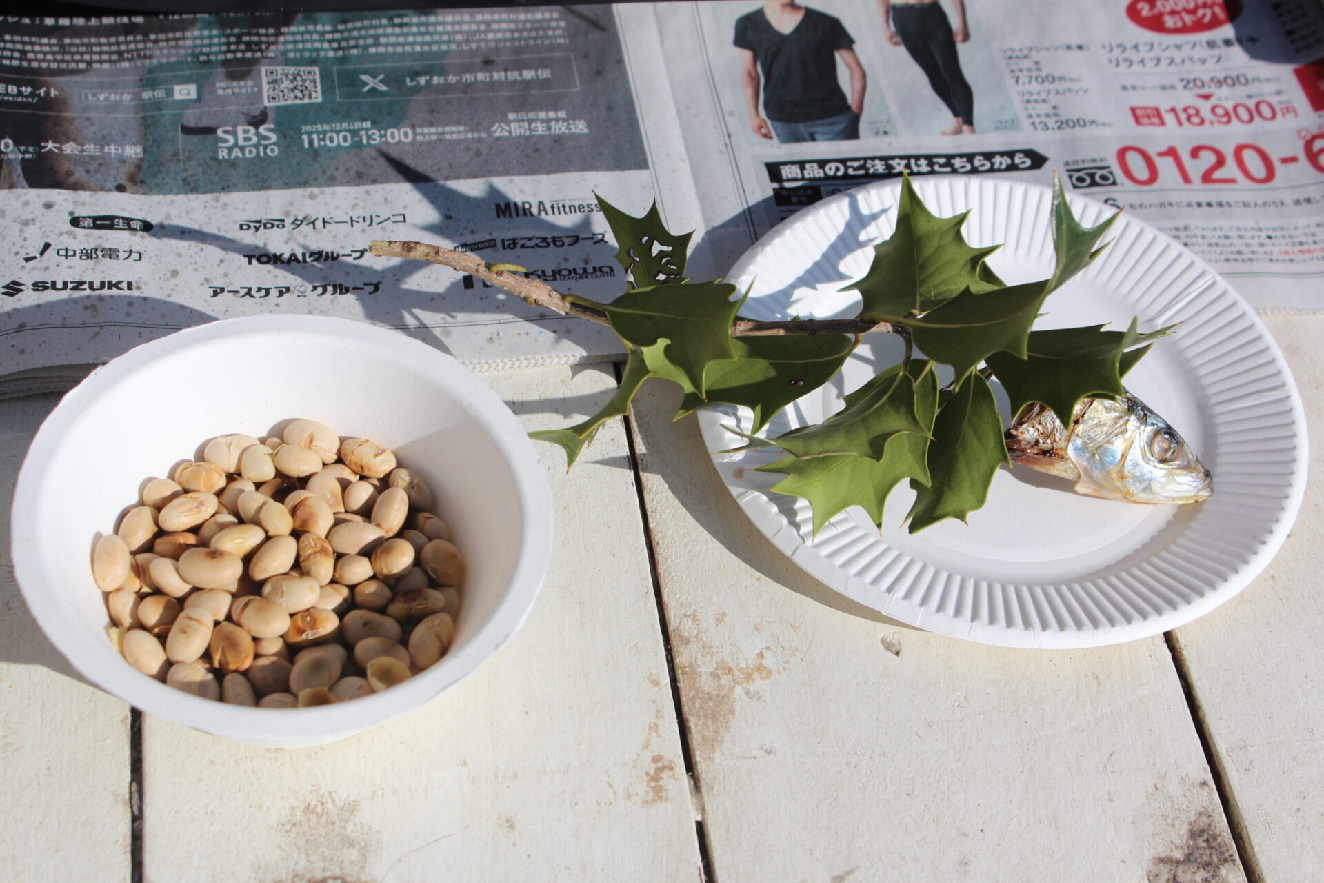 みんなの中にいる「やっつけたい鬼」をパネルに貼って、新聞紙で作った豆や鬼が苦手な鰯と豆とひいらぎも用意して事前準備は万端!朝から「今日は鬼が来るんだよね」とちょっぴりそわそわしている子どもたち。